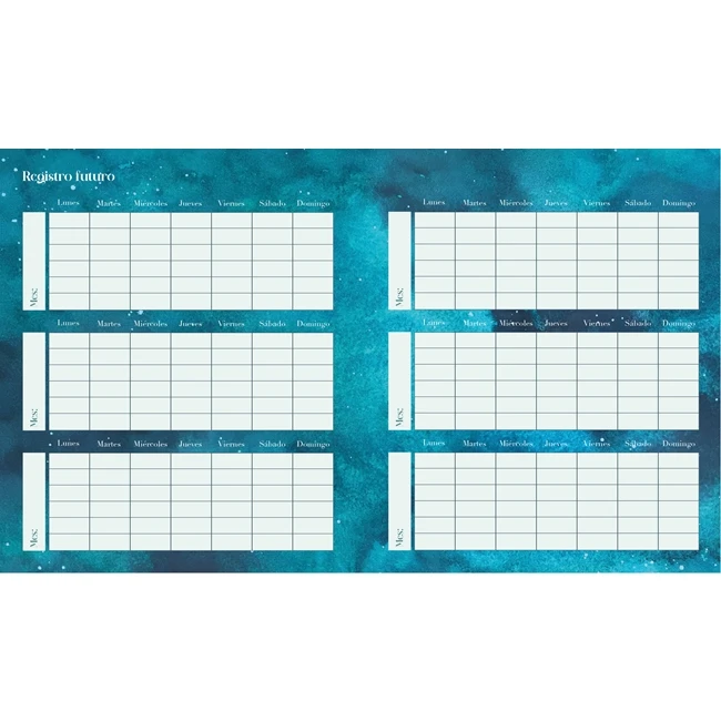 Tapa semi rígida con terminación PP mate y UV sectorizado. Interior cosido en papel mate blanco de 118 Gr. 224 Páginas Impreso a 4 colores. Semana a la vista 17x21 cm. Guarda + separadores temáticos. Registro futuro: Calendario anual, cuadro de gastos mensuales. Registro mensual: Calendario perpetuo del mes, contenido temático específico y frases inspiradoras.