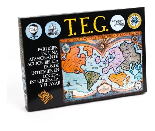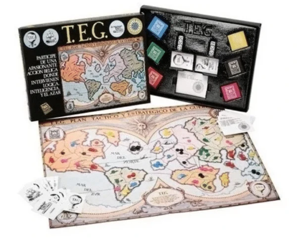 - 1 tablero (mapa dividido en 50 países agrupados en 6 continentes), 6 cajas de colores con 100 fichas (ejércitos) cada una, 50 tarjetas de países y 15 de objetivos , 6 dados, 1 reglamento.