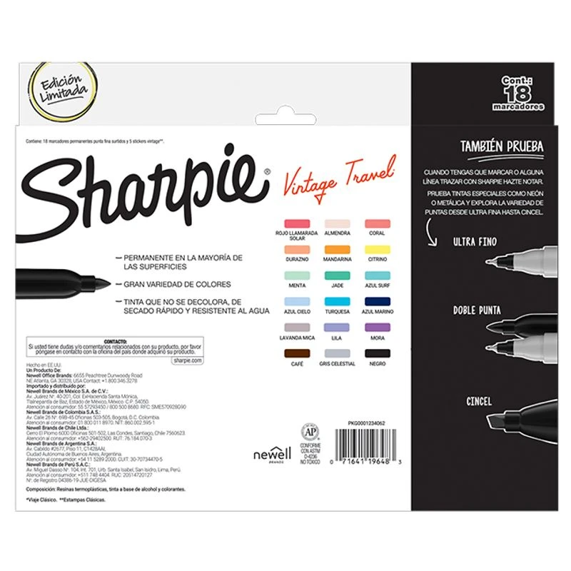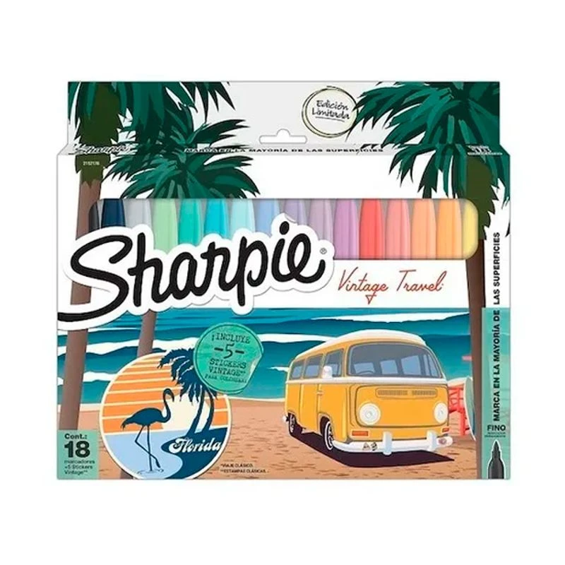 Sharpie colores vintage. Trazo Fino 1 mm.Marcador permanente fino, colores surtidos. Blister x 18 marcadores. Tinta resistente a la decoloracion y el agua, se seca rapidamente. Apta para la mayoria de las superficies, papel, plastico, metal.Nuevos colores vintage.