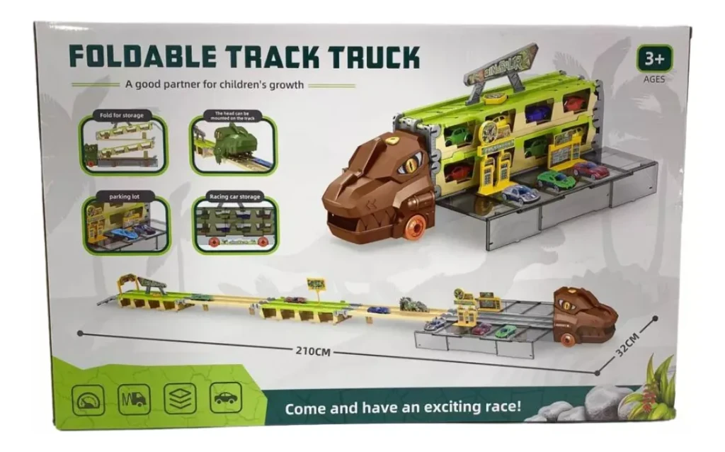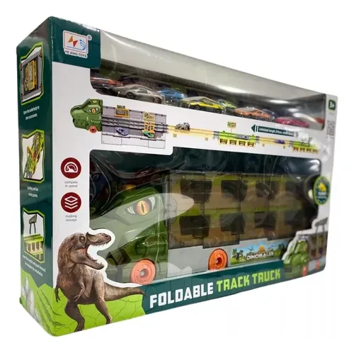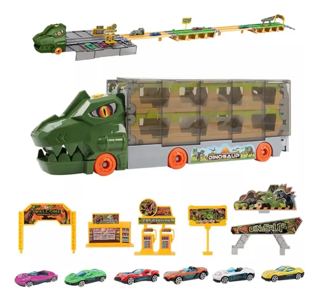 Camión transportador con cabeza de dinosaurio, incluye 2 niveles, 8 autos y un lanzador de vehículos para lanzar tus autos a toda velocidad por la pista de carreras, el mismo brinda una experiencia de juego divertida que fomenta la concentración, interacción y competitividad de los niños.